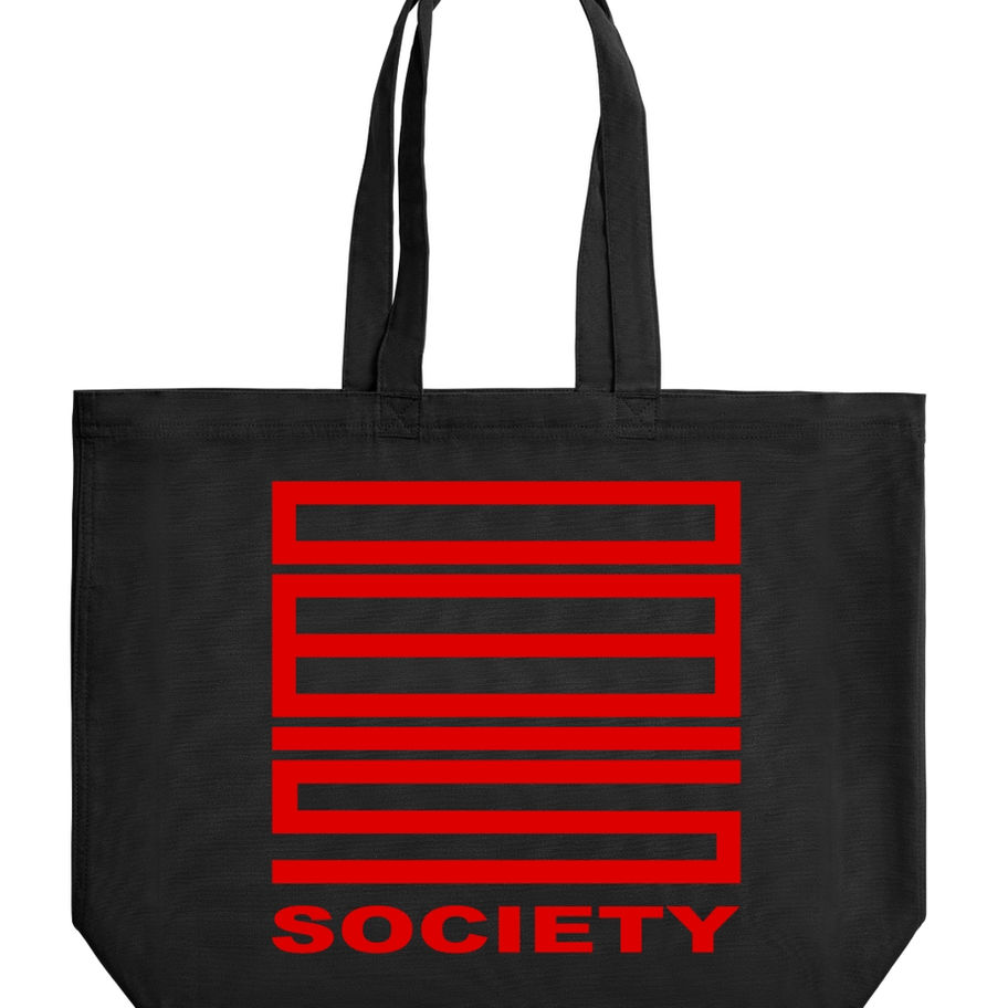 Bi-color tote — one side with white logo, the other in signal red.